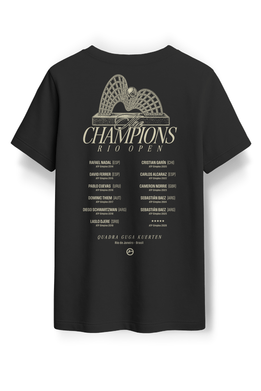 Entre o que chega à loja, destaque para a t-shirt dos Campeões (R$ 150), que homenageia todos os vencedores do torneio — uma verdadeira peça de coleção para os fãs. O design celebra nomes que marcaram a história do Rio Open, como Rafael Nadal (2014), David Ferrer (2015), Pablo Cuevas (2016), Dominic Thiem (2017), Diego Schwartzman (2018), Laslo Djere (2019), Cristian Garín (2020), Carlos Alcaraz (2022), Cameron Norrie (2023) e Sebastián Báez (2024 e 2025).