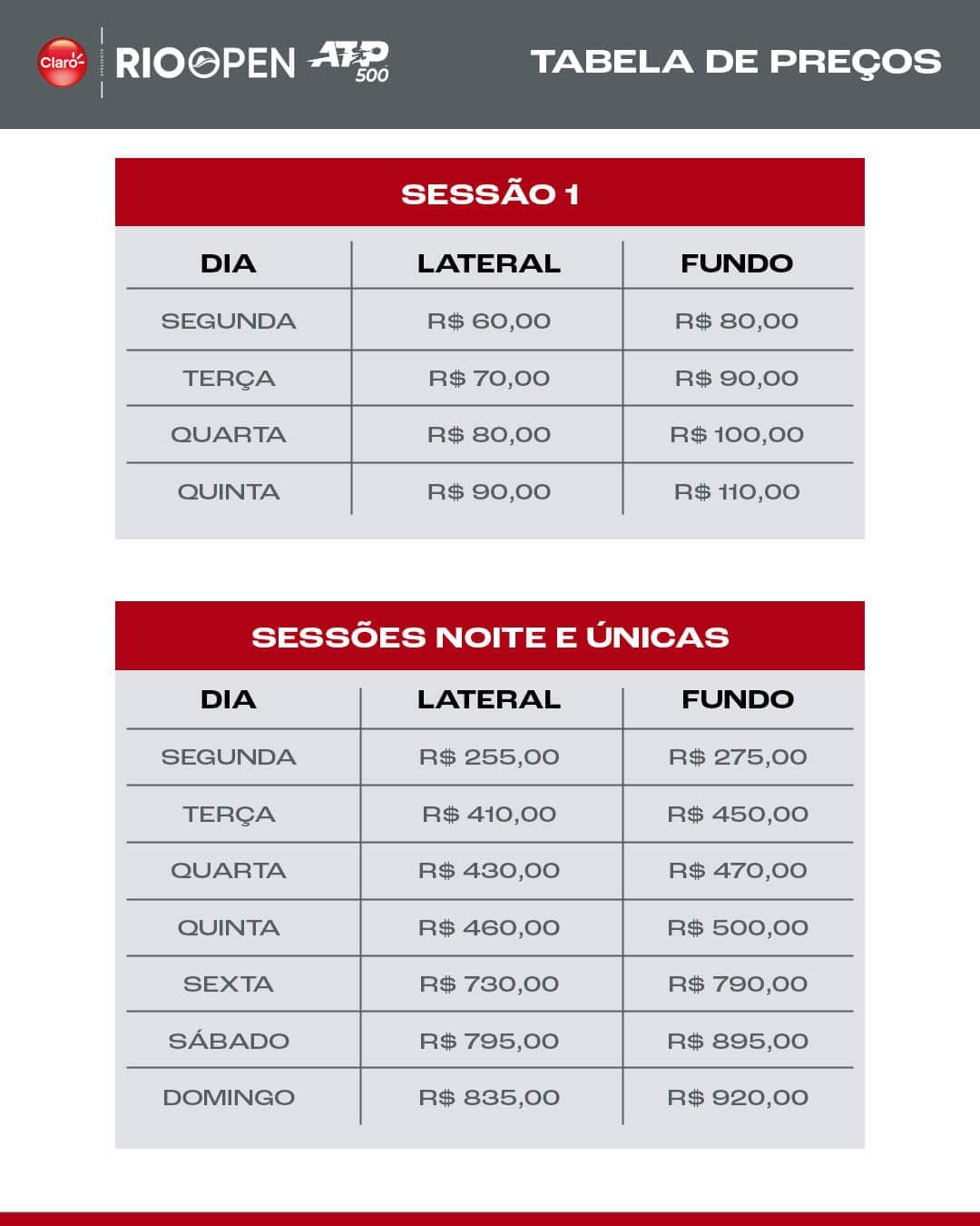 O pagamento dos ingressos para o Rio Open 2026 poderá ser realizado com cartões de crédito Visa, Mastercard, Amex e Elo com parcelamento em até 4 vezes sem juros. Não haverá cobrança de taxa de conveniência. Cada comprador poderá adquirir 4 ingressos por sessão por CPF, totalizando 22 ingressos no máximo.